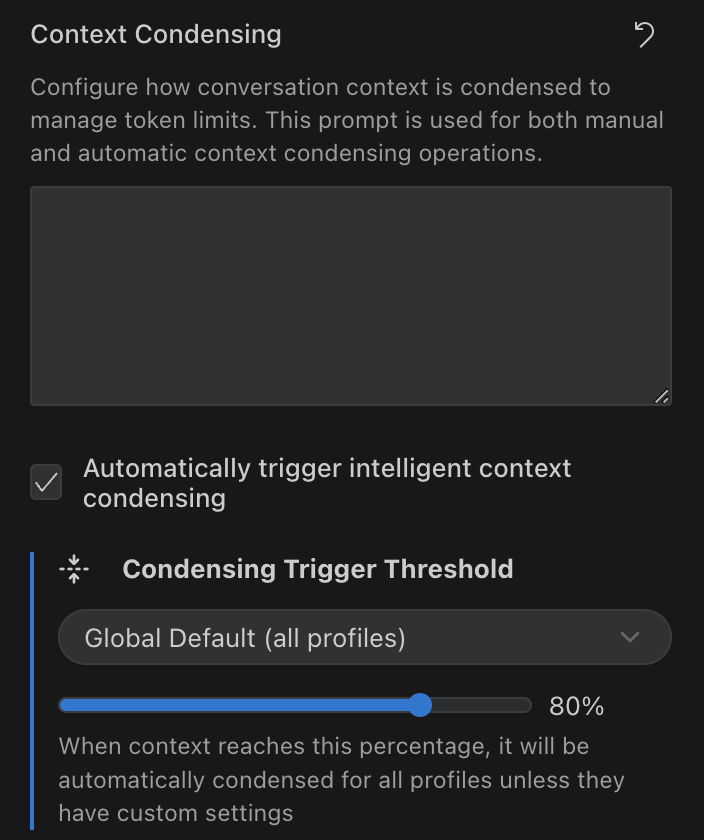 - Threshold to trigger intelligent context condensing: A percentage slider (default 100%) that determines when condensing activates based on context window usage (found in "Context" settings)